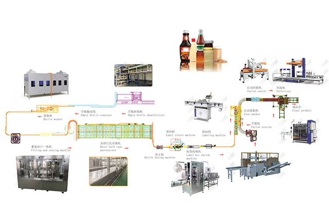 空瓶卸垛——洗瓶——自動濃醬灌裝機——玻璃瓶封口機——殺菌機——套標機——貼標機——開箱機——裝箱機——封箱機——碼垛機