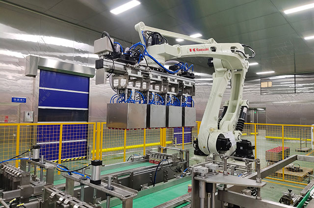 ③ 自動(dòng)完成進(jìn)箱、轉(zhuǎn)箱、分排、成堆、移堆、提堆、進(jìn)托、下堆、出垛等步驟;