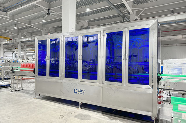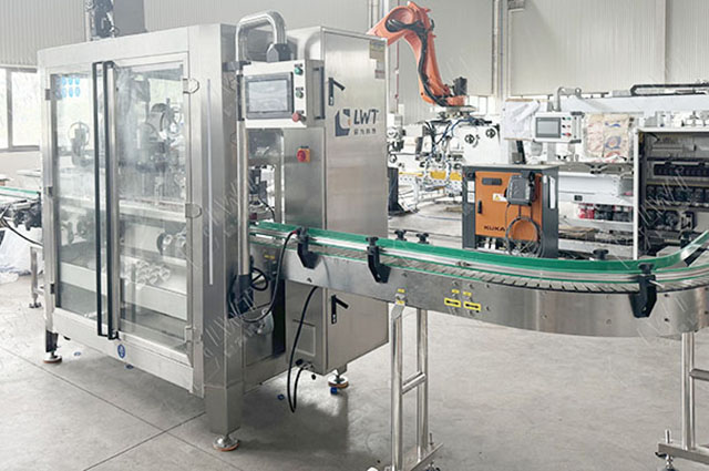 清潔劑灌裝生產線工作流程:灌裝——旋蓋——稱重檢測——膜包收縮——機器人碼垛——纏繞