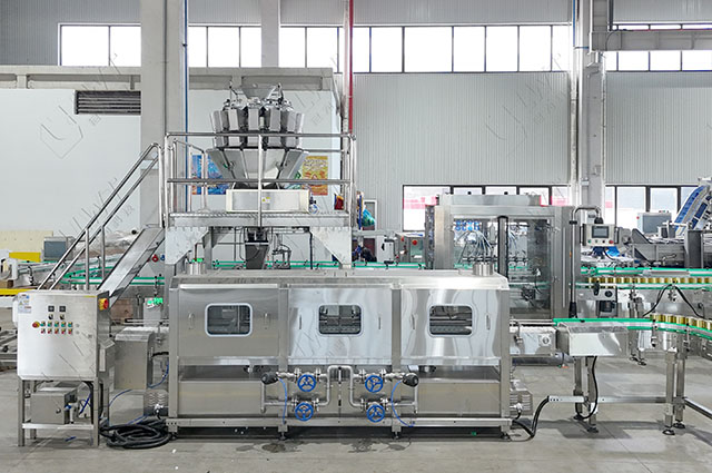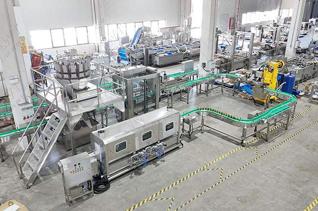 鼓泡清洗-預煮—振動瀝水——固體物灌裝——液體灌裝——封口機——實罐清洗——稱重檢測——自動封箱